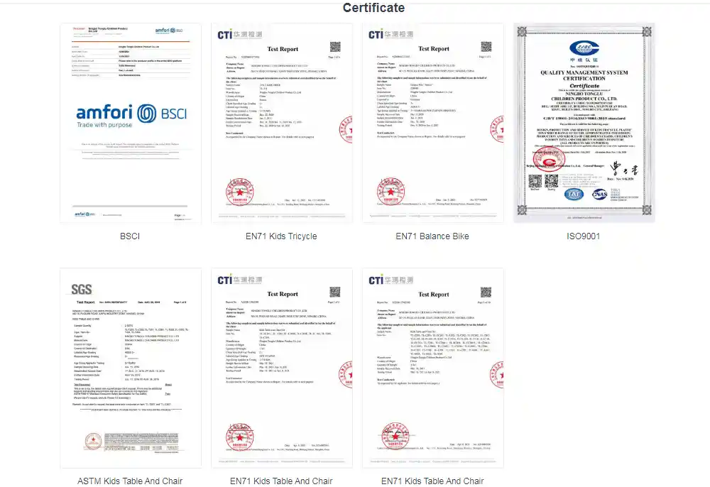 Сертификаты, такие какEN71иАСТМуказать, что нашдетский и детский велосипед for прошел специальные испытания на предмет нетоксичности материалов, порезов рук, прочности деталей и соответствия стандартам безопасности.